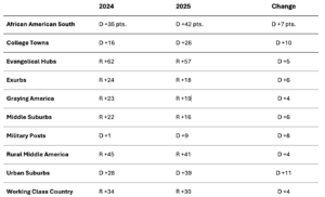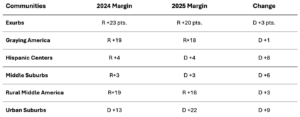 What drives election outcomes is who turns out to vote. The American Communities Project chart below shows exactly where the shifts happen in Virginia. As you can see, while Republicans continue to have strong support in many communities, the shift from support for Republican candidate to supporting the Democrat candidate was the cause for the dramatic gains in the House of Delegates and for the wins in the state-wide offices for Governor, Lieutenant Governor, and Attorney General. These results happened despite strong Republican financial support for candidates up, and down, the ballot. Importantly, working class voters in Virginia shifted +4 points for the Democrats. Since President Trump’s election in 2024, Democrats have been trying to improve their stake among working class voters. This shift shows the results of their efforts as Democrats focused squarely on affordability. Democrats also improved among every voter community including evangelical and rural voters.